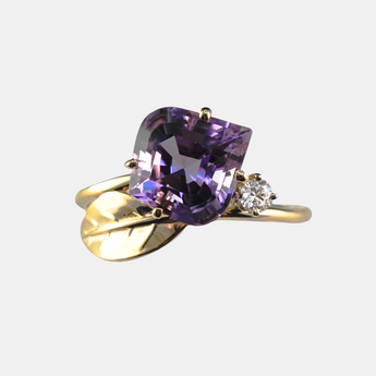 14K Yellow Gold Amethyst and Diamond Ring with a Leaf Design