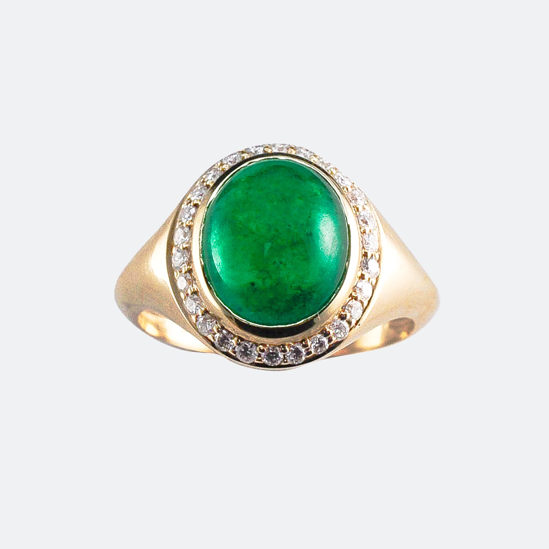 14K Yellow Gold Cabochon Emerald Ring with Diamond Halo