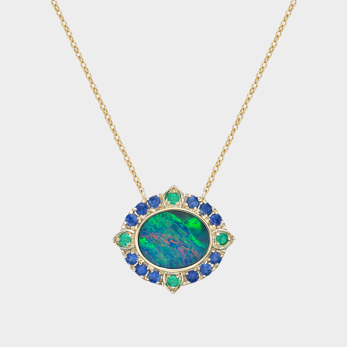 10K Yellow Gold Australian Boulder Opal and Sapphire and Emerald Pendant